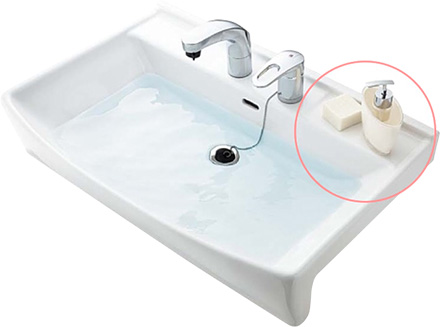 細いエッジがスタイリッシュな陶器製ボウルは、左右に手洗い石けんや歯ブラシスタンドなどを置ける奥行き約8cmのフラットスペースを確保。毎日の使い勝手にこだわりました。